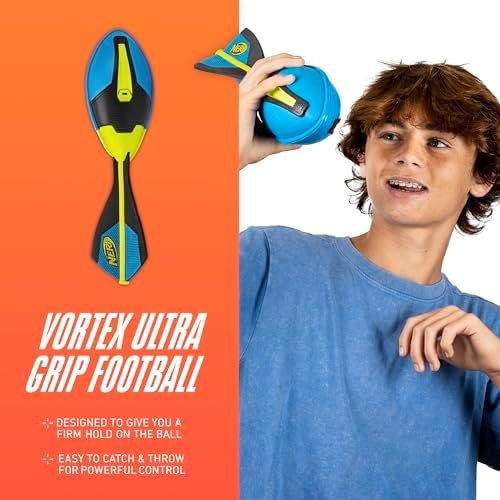 Go deep and air out some killer passes with the NERF Vortex Ultimate Grip Foam Football! NERF is bringing more distance than ever to your football games with our soft foam Vortex Ultimate Grip ball. Designed with built-in air holes and a finned tail for premium aero-dynamic efficiency, you can see and hear the difference as the Vortex flies through the air for maximum distance. Constructed with soft NERF foam, these balls are perfect for kids to throw and catch with ease. The NERF Vortex is all-weather which makes it the perfect beach and pool toy for kids who are looking to take their sports games on the go. This NERF Vortex Ultimate Grip football is built with a textured surface, molded with easy grip grooves, so kids can grab a firm hold of the ball for accurate long-distance passes. Whether kids are playing indoors or outdoors, the NERF foam Vortex football is the best way to bring extreme flying action to their games. So ramp up the distance, and start the fun today with the NERF Vortex Ultimate Grip Foam Football!